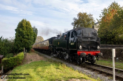 Sunday 19/11/2025 - BR STD Tank 80097 returns from Rawtenstall with the 09.29 service to Bury and Heywood approaching Irewell Vale Station.
