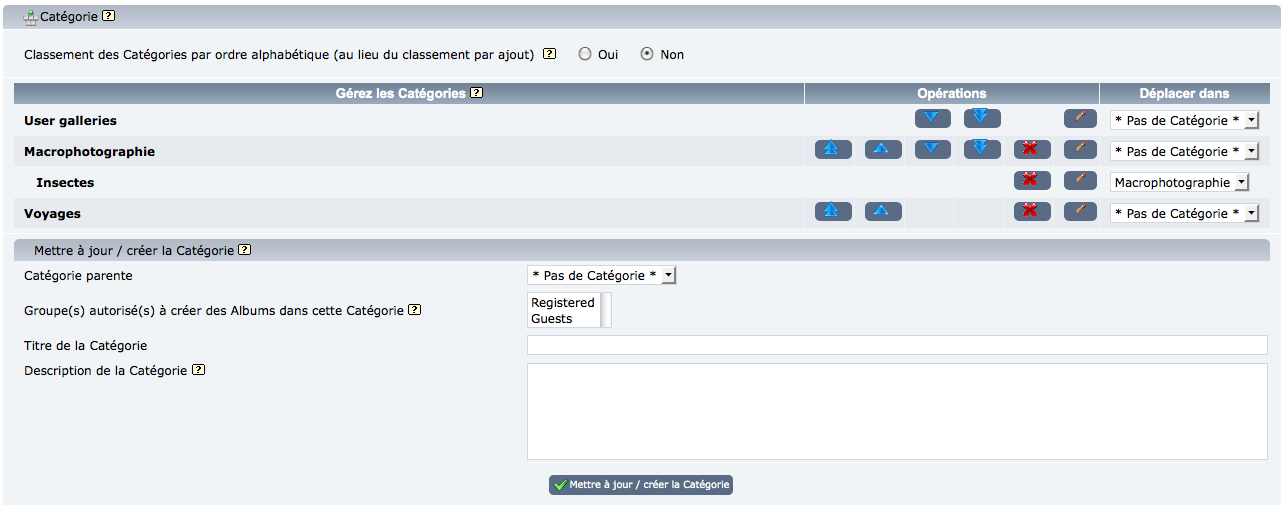 Vous pouvez spécifier comment vous voulez que vos catégories soient triées dans Coppermine: par ordre alphabétique (au lieu d’un ordre personnalisé) mettez en face de "Classement des catégories par ordre alphabétique le paramètre à "Oui". Ce paramètre est disponible dans la configuration de Coppermine et le gestionnaire de catégories. Si vous activez le tri alphabétique, les flèches monter et descendre qui normalement, vous permettent de trier manuellement les catégories disparaissent. Désactivez cette fonction si vous souhaitez organiser vos catégories dans un autre ordre.